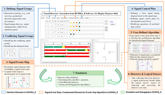 EBC DUMKA_E stands as an efficient programmable system for traffic signal control based on specified rules. With minimal essential information (discussed later in this section), DUMKA_E can offer a complete range of programmable actions suitable for standard traffic control systems. The subsequent section provides a detailed breakdown of the overall architecture of EBC DUMKA_E. Figure 6 illustrates the DUMKA_E interface consisting of several modules where the user’s input is required to develop logic for a traffic signal controller. The minimum information needed to program the desired signal control in DUMKA_E is explained in the following.