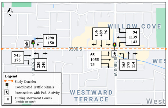 A high-fidelity Vissim microsimulation model of a real-world arterial with two signalized intersections (#5200 and #4800) along 3500 South in Utah, developed previously, [32] was used as a testbed for these two scenarios. The turning movement counts are depicted in the figure, and the speed limit was set to 45 mph, representing the conditions of the study area. This 2-intersection network was chosen because it both offers enough details for exploring the functionalities of signals at the intersection level and provides a chance to investigate the coordinated operations at the corridor level. The PTV Vissim was employed to interface both a field-like controller Econolite ASC/3 and the event-based external controller DUMKA_E in identical conditions. Figure 12 shows the study area.
