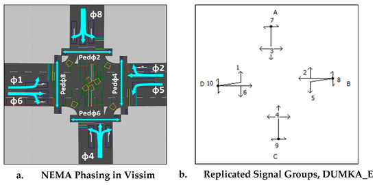 To showcase the modeling capabilities of DUMKA_E, an actuated-coordinated operation was selected that encompasses all crucial aspects of RBC operations (e.g., properly functioning offset values, cycle lengths, green splits, detection, etc.). Two signalized intersections, namely #4800 and #5200, were specifically chosen to fulfill this objective. The traffic demands for these scenarios are moderate, with low pedestrian activities. Figure 13 illustrates the scheme of intersection #4800 in Vissim developed based on the NEMA phasing (Figure 13a) and the layout of signal groups, as designed in the DUMKA_E corresponding to the same intersection (Figure 13b).