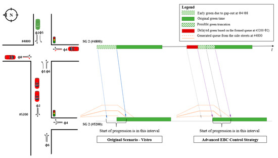 In this scenario, the controller counts the number of vehicles turning left and right from side streets (red vehicles turning NBL and SBR, respectively, in Figure 15) at the upstream intersection (#4800) and decides when to start the coordinated phase φ2 at the upstream intersection based on the predicted size of the formed queue at the downstream intersection (#5200). This way, the EBC control logic prevents the platoon from being stopped at the downstream intersection, leading to more efficient coordination.