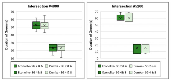 As depicted in Figure 16, the outcomes reveal that DUMKA_E’s actuated-coordinated controller operates on par with the actuated-coordinated controller in the Econolite controller. The only deviations occurred in less than five instances, contributing to less than 4% differences, which were attributed to occasional minor inconsistencies. In the remaining cycles, a consistent phasing pattern was maintained, with identical start and end times for green lights, resulting in almost identical average green durations. Detailed explanations for these occasional inconsistencies are provided in the subsequent section.