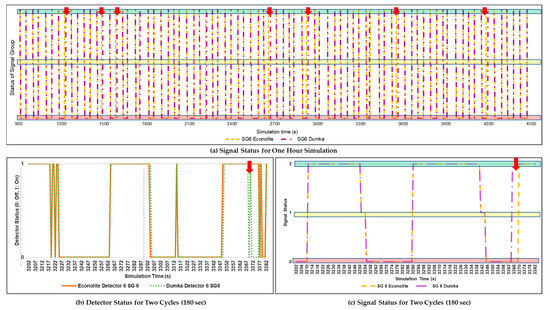 These minor changes in detector status between DUMKA_E and Econolite can be explained as a discrepancy in detection (Figure 17). Figure 17a illustrates the detector status for signal group 6 for a full hour in Econolite and DUMKA_E. Figure 17b,c show two selected cycles illustrating one of these cases on the detector status diagram and signal status diagram. It should be noted that the detection itself is not necessarily the original cause of these discrepancies. Each controller has a particular timing when it processes detector data and decides which signal status (for each phase) must be set for the next second. Therefore, these decision timings in DUMKA_E and Econolite are slightly different and, occasionally, may result in different decisions. Nevertheless, this does not imply any errors in DUMKA_E or its inability to replicate Econolite properly.