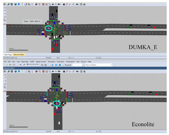 Additionally, the controllers might have distinct signal revision schedules (e.g., one with time points at 0.0 s, 1.0 s, 2.0 s, ..., and another with 0.1 s, 1.1 s, 2.1 s, …). To investigate this discrepancy in detail, the previous cycle was examined. Figure 18 depicts 3354 s of simulation in both scenarios, focusing on active signal groups 4 and 8. The blue ovals highlight the same vehicle traveling from south to west. Despite the screenshots being captured at the exact simulation second and both controllers replicating the same signal control logic, there is a discrepancy in the location of the specific vehicle. This discrepancy could result from drivers in Vissim reacting differently to signal statuses, influenced by minor operational disparities between controllers or related to the startup state and transition logic of ASC/3, introducing slight perturbations. The ASC/3 may occasionally experience force-off errors and transitions, even without apparent reasons, justifying the mentioned discrepancies.