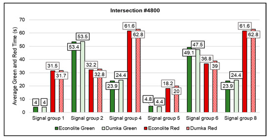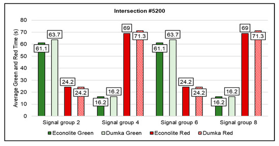 Figure 19 and Figure 20 represent the average duration of green and red for each signal group for intersections #4800 and #5200, respectively, modeled in DUMKA_E and Econolite ASC/3. Comparing the reported results proves that DUMKA_E has 97.6% accuracy in replicating RBC operations in terms of the average duration of green and red times between these two control methods for all the signal groups. These results again demonstrate that the DUMKA_E as an EBC can almost fully replicate an actuated-coordinated controller (in this case Econolite ASC/3).