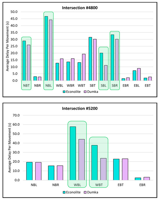Figure 21 displays the average delay per movement for each phase at both intersections. The proposed strategy adjusts the start point of phase 2 at intersection #4800 based on the right (phase 8) and left (phase 4) turns at that intersection. This modification significantly reduces delay by over 30% between intersections #4800 and #5200 in the E–W direction (WBL and WBT at #5200). While this control strategy benefits vehicles approaching intersection #5200 by postponing phase 2 and phase 5 at intersection #4800, it does lead to increased average delays for these phases at intersection #4800, as evident in Figure 16 (WBL, WBR, WBT). It should be noted that the advanced scenario was developed for the sake of showing the advanced capabilities of the EBC and not necessarily for improving the operations at all phases of the investigated intersections. The average delay for intersection #5200 has notably decreased (highlighted in green). This novel strategy in DUMKA_E results in a 42.3% lower delay for the E–W approach (WBT at #5200) compared to a typical actuated-coordinated RBC controller. Other movement delays remain nearly the same in both controllers, as indicated by the remaining results.