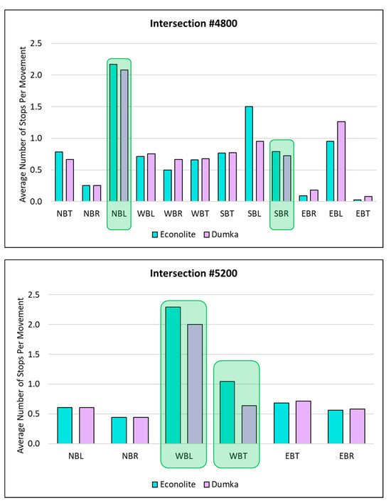 Figure 22 illustrates the average number of stops per movement at both intersections. The proposed strategy involves adjusting the starting point of SG 2 at intersection #4800 based on the right (phase 8) and left (phase 4) turns at that intersection. The objective is to decrease the average stops for intersection #5200 in the westbound (WB) approach, highlighted in green. In DUMKA_E, this new strategy achieves a 26.6% reduction in the average number of stops for the east–west (E–W) approach at intersection #5200 compared to a typical actuated-coordinated RBC controller. However, the strategy’s primary goal of delaying the green start for the WB approach at #4800 results in an increase in the average number of stops for SG 2 and SG 5 at intersection #4800, as shown in Figure 22 (WBL, WBR, WBT). This trade-off aligns with the strategy’s intended outcome. Importantly, the results indicate consistent average stops for the remaining movements between both controllers.