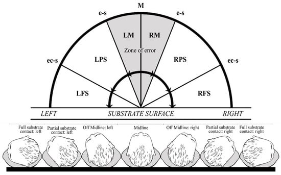 The seven-item scheme for coding of neonatal head postures arranged within a 180° space as determined by a multidimensional analysis []. Corresponding illustrations of postural amplitudes are also presented. M = midline; RM = off-midline right; LM = off-midline left; RPS = right partial substrate contact; LPS = left partial substrate contact; RFS = right full substrate contact; LFS = left full substrate contact; e-s = ear substrate contact; ec-s = ear and cheek substrate contact.