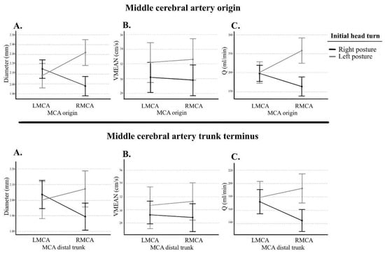 Interaction effects of middle cerebral artery origin (top) and trunk terminus (bottom). Diameter (A), VMEAN (B), blood flow volume (C) at initial head turn. Error bars show the 95% confidence interval. LMCA = left middle cerebral artery; RMCA = right middle cerebral artery; VMEAN = mean velocity; index; Q = blood flow volume.
