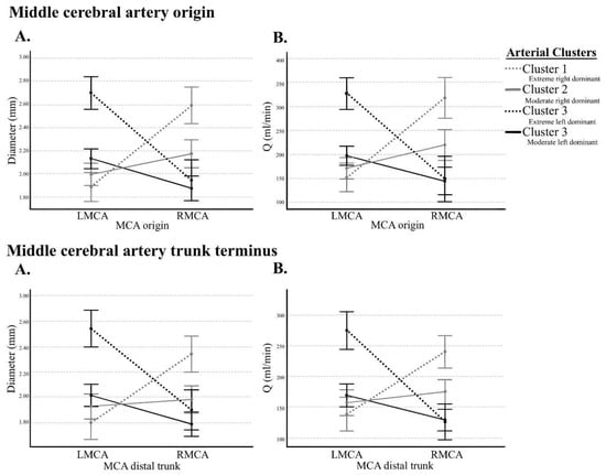 Interaction effects of bilateral middle cerebral artery origin and distal trunk diameter (A), Q (B), and cluster membership. Majority clusters are represented by a solid line and minority clusters by a stippled line. Error bars show the 95% confidence interval. LMCA = left middle cerebral artery; RMCA = right middle cerebral artery; Q = blood flow volume.