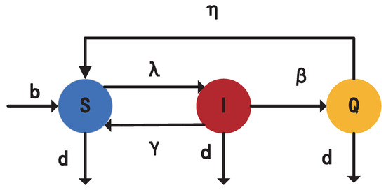 The block diagram of the SIQS model. Here S, I, and Q represent susceptible, infected, and quarantined states.