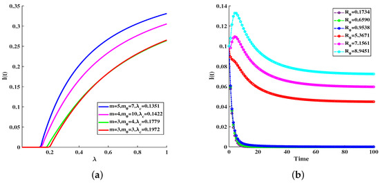 Figure 3a shows a bifurcation diagram of model system (3). It clearly appears that model system (3) exhibits a forward bifurcation, that is, the disease-free equilibrium is stable if , while if , the disease-free equilibrium is unstable, and there exists a unique endemic equilibrium which is stable. This result is consistent with the result shown in Figure 2b.