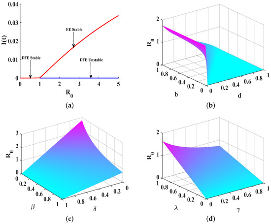 (a) Bifurcation diagram of model system (1). EE is the endemic equilibrium , DFE is the disease-free equilibrium : , , , , , . (b–d) The combined influence of parameters on . (b) The relationship between and b, d: , , , , . (c) The relationship between and , : , , , , . (d) The relationship between and ,: , , , , .