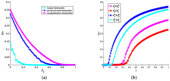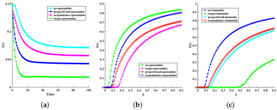 (II) Secondly, we depict the effectiveness of the immune and quarantining control strategies in Figure 4 and Figure 5. In this part, we also discuss the SIQS model (1) on the network with various immunization (proportional immunization strategy , target immunization strategy , acquaintance immunization strategy ) schemes based on [51] and define quarantine schemes of infected individuals (proportional quarantine strategy , target quarantine strategy , acquaintance quarantining strategy ) according to various immunization schemes. Then, we define the heterogeneous quarantine rate as follows: