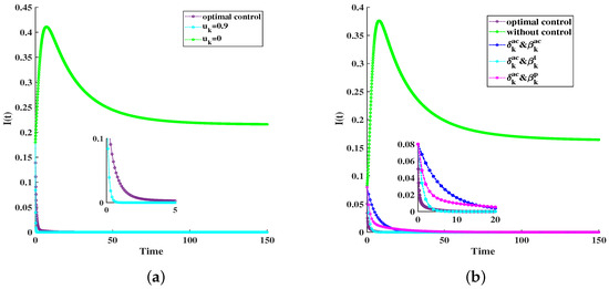 (III) Thirdly, we analyze and illustrate the optimal control and various quarantine schemes by numerical simulations, as shown in Figure 6 and Figure 7. In Figure 6, we depict under different control strategies. In order to provide a clearer representation of the findings in Figure 6a, we additionally compute the objective function values for diverse control approaches, as shown in Table 4. In the absence of any control strategy (i.e., ), the infection ultimately breaks out and reaches a stable level of infection. We also set a fixed control strategy compared with the optimal control strategy, finding that if we want to obtain better results than the optimal control strategy, it will usually lead to a significant increase in control costs (i.e., ). In Figure 6b, we compare, the effects of optimal control, without control, and acquaintance immunity, combining these with multiple quarantine strategies for infectious disease control. Compared with other strategies, the optimal control strategy has the best control effect.