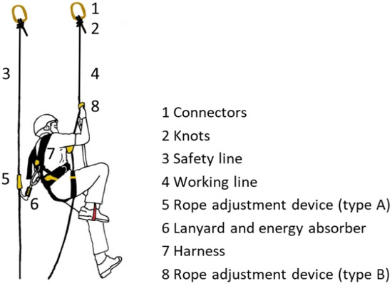 Fall arrest systems (FASs) are included in the European Standard (EN) 363 [9]. Rope access systems (RASs) are FASs in which the worker is positioned by ropes at the operation point. Ropes are the main element of an RAS. Figure 1 represents the main RAS components. Using a carabiner (1 in Figure 1), the knots connect the rope to the structure (2 in Figure 1) [10,11,12,13,14,15,16,17].