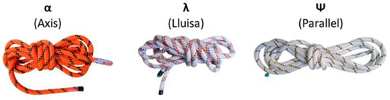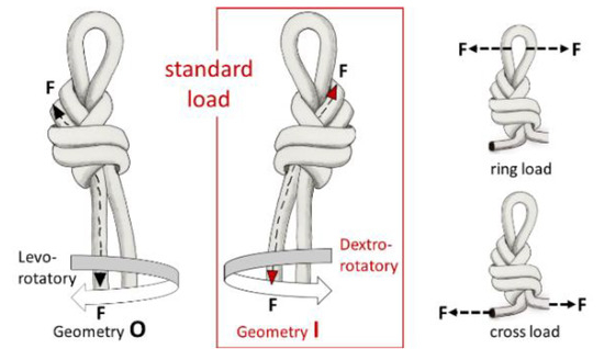 The knots in this paper were studied by applying a load longitudinally to the rope axis (standard load), as this is how knots are loaded when used in RASs. From a geometrical perspective, each knot has two symmetrical versions in its construction. In this study, we examine the I-geometry (see Figure 5, red centre); i.e., a symmetrical version of knot construction with the loops in a dextrorotational direction. A well-made knot is particularly important to ensure the homogeneity of the results and draw the correct conclusions. To this end, all knots in this work were made by the same person who is an expert in fall protection systems, a specialist in RASs, a firefighter, and a rescuer with more than 30 years of experience.