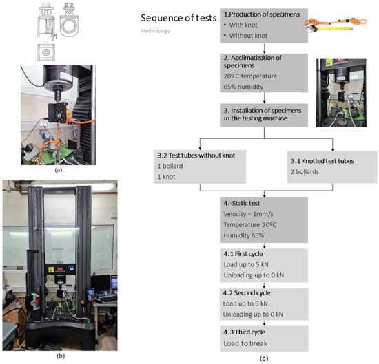 The rupture tests described in this paper were carried out at the Geotextiles and Geosynthetics Laboratory of the AITEX/Research and Innovation Centre. An INSTRON model 5984HK8242 dynamometer with a maximum capacity of 150 kN was used. This machine allows both the force and displacement to be controlled (Figure 6). The force was recorded with an INSTRON load cell, using a full scale of 150 kN and a measurement frequency of 50 Hz. Data management was carried out using Bluehill software (Bluehill version: Universal V4.15), also from INSTRON (INSTRON version: 5984). The knotless rope tests were carried out using a Zwick Roell Z600E (Manufacturer: Instron, City: Barcelona, Country: Spain) maximum-capacity dynamometer with an integrated cell. A bollard (13 cm in diameter) was used to hold the free end (without a knot or sewn end). The free end was wrapped around the bollard at least three times to ensure sufficient friction between the rope and the bollard to prevent the rope from slipping (Figure 6a,b). The last section of rope was secured with a clamp stopper to prevent slippage. The testing machine and a croquis of the bollard used are shown in Figure 6. The smaller the diameter, the higher the stress concentration; thus, a smaller diameter may cause a breaking point to contact the bollard. To measure the tensile breakage correctly, the rope should theoretically break when the first loaded knot becomes strangulated [11,26,32,50]. If the knot breaks on contact with the bollard, the test method is incorrect, and the true tensile break is not obtained. Once the specimen has been conditioned, the knot is installed in the loading gantry. Then, the cylinder is inserted through the core of the knot and secured with a locking mechanism. The setup and procedure of the experiment are shown in the flow chart in Figure 6c.