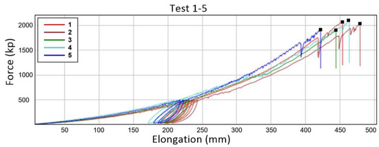 From a strictly statistical perspective, several authors stated that tests should be repeated at least five times for each specimen, especially for systems that affect employee safety and life [35,41]. These recommendations are in line with the American NFPA 1 [49]. Drohan [34] stressed the importance of conditioning samples 72 h prior to testing and performed an atmospheric control test at 20 °C under 65% humidity, as specified in ISO 139:2005/A1 [29,42,53]. Some authors consider the number of cycles before the breaking load to have a significant effect on the obtained results. Baszczyński [54] observed significant differences between the load-elongation characteristics obtained in the first load cycle and those obtained in subsequent cycles and concluded that the organisation of the textile structure was more strongly affected during the first load. After working with new ropes, Gómez [40] concluded that ropes break at lower loads when new.