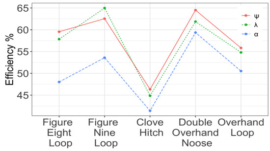 The effect of each rope and knot on the efficiency was analysed using the ANOVA after obtaining the efficiency values for each rope and knot. Table 4 shows the estimated effects of the knot and rope on the efficiency when no interaction was included in the model [63].