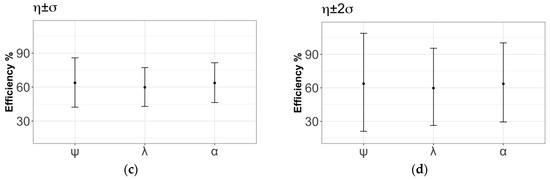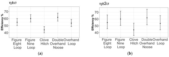 Figure 12a shows the data for the figure eight knot, with a mean efficiency of 54.84% and confidence intervals of 1σ (50.07, 60.11) and 2σ (45.72, 66.02). This is undoubtedly the most commonly studied knot and that with the largest number of results available from previous studies. Higher efficiency values have been obtained by many authors. For example, Diamond [39] reported an average efficiency of 70%. However, he did not report important aspects of the test methodology, such as whether the rope was used or new, the test speed, or whether the samples were acclimatised. Šimon [41] found a mean efficiency of 64.42%. The resulting confidence interval was considerably lower than that obtained here, because Šimon used only one type of rope, whereas this study used three different rope models. Merchant [38] obtained a 75% efficiency for used ropes. However, he did not clearly define the experimental procedure or the manufacturer’s breaking strength. Milne [35] found an efficiency of 76% for new ropes and used his own tests to assess the ropes’ breaking strengths. Boron [25] reported an efficiency of 77% for new ropes using a well-defined methodology but used the manufacturer’s breaking load as a reference.