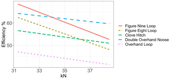 The obtained knot efficiency can be empirically represented as a decreasing line depending on the static breaking load of the rope. In the same way, a decrease in the knot efficiency can be observed as the rope diameter increases. The interaction data showed that a favourable or unfavourable knot behaviour occurred independently of the type of rope used from the perspectives of strength and efficiency. There was also a large variation in tensile strength depending on the choice of knot type. The rope type selection had no such significant influence. The figure eight- and figure nine-family knots were affected by a much more rapid loss of efficiency as the breaking strength of the rope increased. For the other knots, this phenomenon was less pronounced.