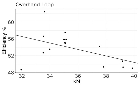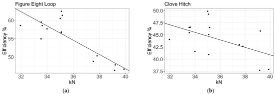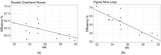 The average efficiency for the overhand loop was 53.60%, while the confidence intervals were 1σ (48.70, 59.00) and 2σ (44.19, 65.02). The regression gave the following expression: η(y)= −0.78 (y – 34.996) + 53.717% (Figure 13). Šimon [41] reported a result similar to that obtained in this study for this type of knot, using five ropes and 108 trials (η (y)= −0.62 (y − 32.79) + 60.67%). Šimon reported a mean efficiency of 56.92% when testing only one type of rope. The confidence interval was slightly lower but remained within the expected values. Drohan [34] reported an average efficiency of 65% with an 11 mm low-stretch kernmantle rope. Drohan ran six tests on samples that were preconditioned at 20 °C and 65% humidity but did not perform any preload cycles. The breaking strength value was that which was provided by the manufacturer. Similar to Drohan [34], Brown [26] reported an efficiency of 65.28% and used 10 mm dynamic ropes. Brown also included the results of tests using a knot tied around a metal tube, increasing the efficiency by reducing the rope curvature at the knot [63]. Considering past studies, the present results seem reasonable, as previously reported efficiencies tend to cluster around the values in the present study.