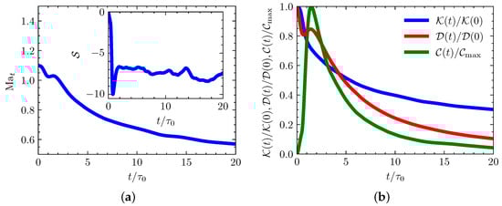 (a) Time evolution of the turbulent Mach number and the skewness of the longitudinal velocity derivative (shown in inset). (b) Time evolution of the kinetic energy normalized by its initial value , the enstrophy normalized by its initial value and the average squared dilatation normalized by its maximum value .
