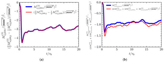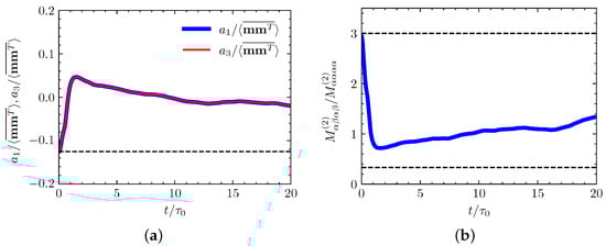 Figure 2 shows the time evolution of quantities relating to the independent components of the second-order moments. Figure 2a shows the equality of and normalized by the average squared Frobenius norm of the velocity gradient tensor . The initial value of (and ) reaches the incompressible limit of , which can be proved by using Table 3 and Equation (7a)