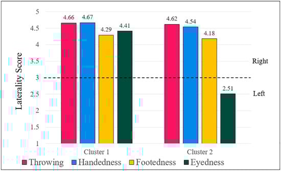 Cluster centres for right-handers. Note: A grouped bar chart displaying the cluster centres for right-handers. The y-axis shows the laterality scores of the cluster centres, and the x-axis separates the two clusters, with separate bars indicating the four measures. Numbers above each bar constitute the co-ordinates of the respective clusters. 1 = extreme left; 3 = both equally; 5 = extreme right. The dotted line indicates the “both equally” neutral point of the scale. Cluster 1 contains consistent right-handers, and cluster 2 contains left-eyed right-handers. The number of observations in cluster 1 was 426, and the number of observations in cluster 2 was 186.