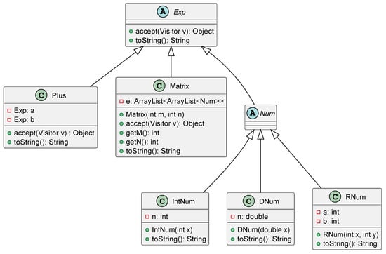 The evaluation of matrix multiplication is handled within the visit() method with the formal parameter of an object of type Times. Initially, if two operands of the operation are matrices, it is verified whether the number of columns in the first matrix is equal to the number of rows in the second matrix , in accordance with the well-known mathematical rule of matrix multiplication. This verification step guarantees the size consistency of two matrices just before multiplying them. The relevant fragment of code is provided in Listing 15.