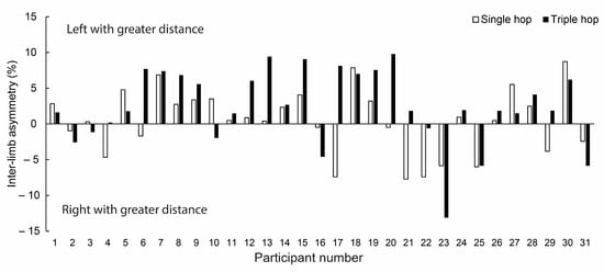 Asymmetries were calculated for single-leg hop and unilateral triple hop, using the following formula: asymmetry (%) = ((max (left or right) − min (left or right))/(max (left or right)) × 100 [9].