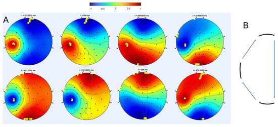Brain micro-states are defined as relatively stable (with weak changes) distributions of electric potential observed over sufficiently long time intervals (tens of ms), with swift transitions between them [16]. Several predominant micro-states can account for a significant portion of the observation time. To streamline the analysis of micro-states, they can be characterized using parameters such as the maximum and minimum of the potential distribution (including the direction of the interval connecting them) [15,26] or by tracing the time trajectory of its maximum (Section 3.4).