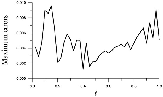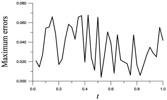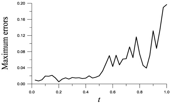 Take and . ME is as shown in Figure 2, and RMSE = is obtained. Notice that = 7.83, which reveals that the recovered function with ME = is very accurate. When and are not given, ME raises to .
