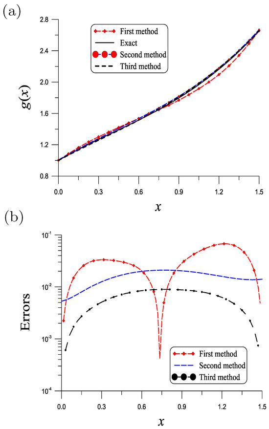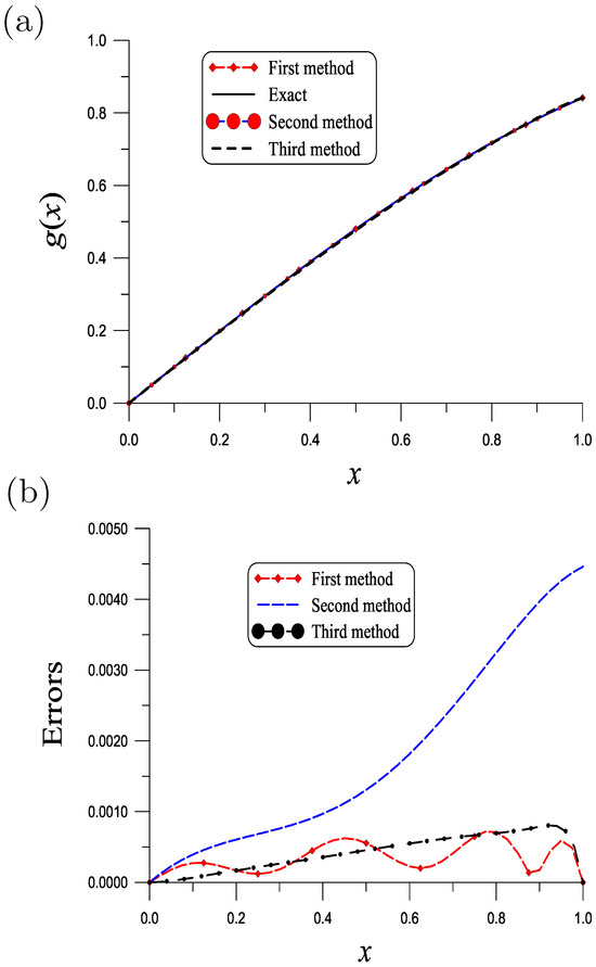 With , , , and , good result is obtained by the first method as shown in Figure 4a. The ME over the unit interval is as shown in Figure 4b. Under the same values of parameters, the result obtained by the second method is shown in Figure 4a, whose ME is as shown in Figure 4b. The ME rendered by the third method with and is as shown in Figure 4b. The CPU times for the first, second and third methods are, respectively, 8.69 s, 1.56 s and 0.67 s.