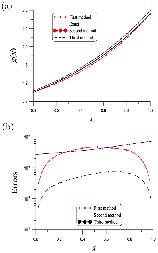 By , , , and , good result is obtained by the first method as shown in Figure 6a. ME over is as shown in Figure 6b. The result obtained by the second method is shown in Figure 6a, whose ME = is seen from Figure 6b. ME = is obtained by the third method with and as shown in Figure 6b. The CPU times for the first, second and third methods are, respectively, 2.51 s, 0.39 s and 0.21 s.
