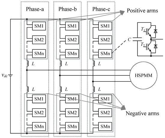 Eventually, multilevel converters have become a more suitable choice for high-power HSPMMs in industrial applications [15], particularly, the modular multilevel converter (MMC) [16]. Compared with other multilevel converters, the MMC presents several features. Firstly, it has a highly modular structure, eliminating the need for multiple isolated DC power supplies and transformers. Secondly, it realizes the high-voltage and high switching frequency multilevel outputs with low-voltage switching devices, which reducing the switching losses. Finally, it also has a common DC bus, which is highly reliable and covers a wide range of power levels [17,18,19].