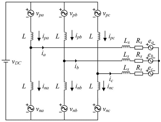 The three-phase symmetrical equivalent circuit of the MMC for the HSPMM drive application is demonstrated in Figure 2. v d c is defined as the DC bus voltage , v p j ( j = a , b , c ) is the positive bridge arm voltage, v n j ( j = a , b , c ) is the negative bridge arm voltage. i p j is the positive bridge arm current, and i n j ( j = a , b , c ) is negative bridge arm current. L is the bridge arm inductance. i j ( j = a , b , c ) are the three-phase AC output currents. L s and R s are the motor stator inductance and resistance, respectively. The back EMFs of the motor are e j ( j = a , b , c ).