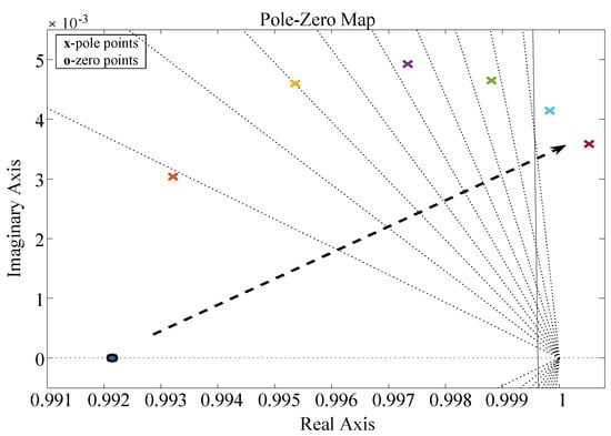 The complex planepole-zero map of the closed-loop transfer function with the variation in the running frequency from 0 to 600 Hz is demonstrated in Figure 3. It can be observed that with the increase in the electric frequency, the pole of the current regulator gradually moves upward to the circle and finally outside the unit circle in the right plane, the current loop loses its stability. Therefore, when the fundamental frequency of the system is over 400 Hz, the performance of the conventional PI controller is very poor, and even the closed-loop system oscillates and is unstable. Therefore, when the frequency is high, the conventional PI controller is not suitable for MMC drive systems, and a novel discrete-time current regulator should be designed.