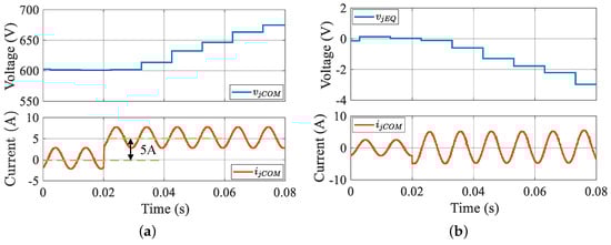Figure 13. Dynamic performance of the current controller: (a) the q-axis reference current steps from 15 A to 18 A, and (b) the q-axis reference current from 18 A to 20 A.
