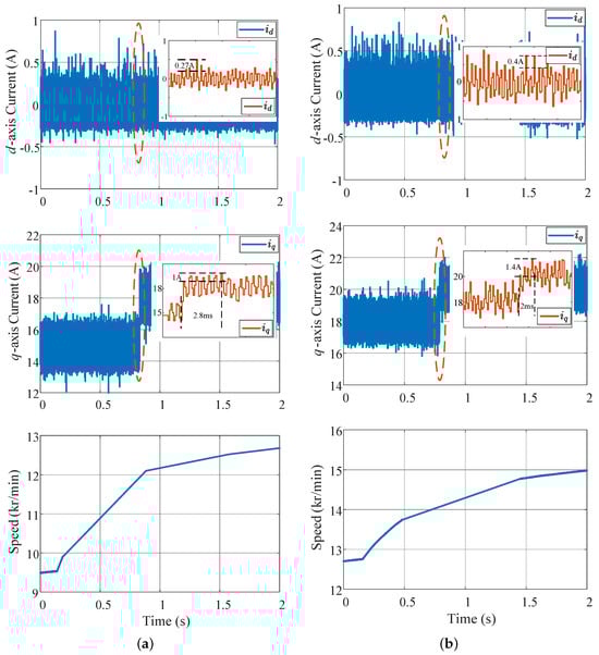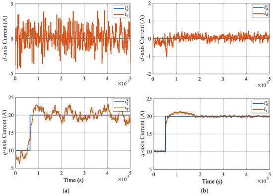Figure 8. d q -axis current: (a) conventional PI regulator, and (b) discrete-time current regulator.