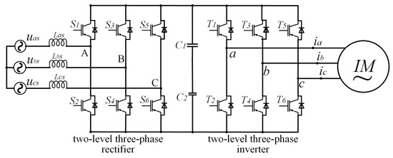 Power conversion can usually be divided into four categories, namely rectification (AC-DC), inversion (DC-AC), chopping (DC-DC), and AC-AC conversion. As mentioned before, the power converters studied in this paper mainly include rectifiers and inverters. Figure 1 shows the topological structure of a variable frequency speed control system for an induction motor, which includes a rectifier and an inverter. The three-phase AC power provided by the left power supply is first converted into DC through the two-level rectifier, filtered by DC bus capacitors, and then converted into specific AC by the inverter to drive the induction motor (IM) on the right. Each phase of the power supply and IM corresponds to a leg, which is composed of two power transistors. The control system generates gate signals through control algorithms to control the conduction and shutdown of each power transistor, causing the inverter to generate a specific amplitude, frequency, and phase currents. In the healthy condition, the output three-phase currents , and are identical sine waves with only a phase angle difference of , so they are also called “three-phase symmetrical currents”. After the three-phase symmetrical currents pass through the symmetrical three-phase stator winding, a circular rotating magnetic field is generated, which drives the motor to rotate. This concise and elegant symmetrical design reduces system complexity, and improves output performance, which is of great significance [25].