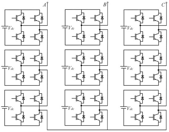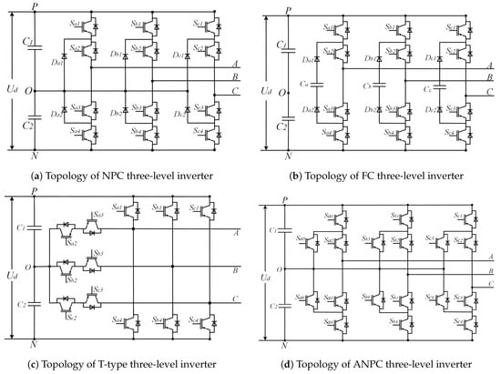 In addition to two-level converters, symmetry is commonly present in power converters, as shown in the four types of three-level inverters in Figure 2, the multi-level cascaded inverters in Figure 3, and the matrix converters in Figure 4. In Figure 1, in terms of the overall structure, the two-level three-phase rectifier and the inverter are symmetrical, except that their input and output are exactly opposite. Within the inverter and rectifier, the legs corresponding to each phase are symmetrical, and for each leg, its upper and lower halves are also symmetrical. Compared to two-level power converters, three-level converters have multiple topologies. Figure 2 shows four typical three-level inverter topologies, namely, the neutral point clamped (NPC), the flying clamped capacitor (FC), the T-type, and the active neutral point clamped (ANPC) three-level inverter. Though different from each other, the four inverters are all highly symmetrical in structure. The same applies to other multi-level power converters, which have more diverse topological structures but always share the common property—symmetry.