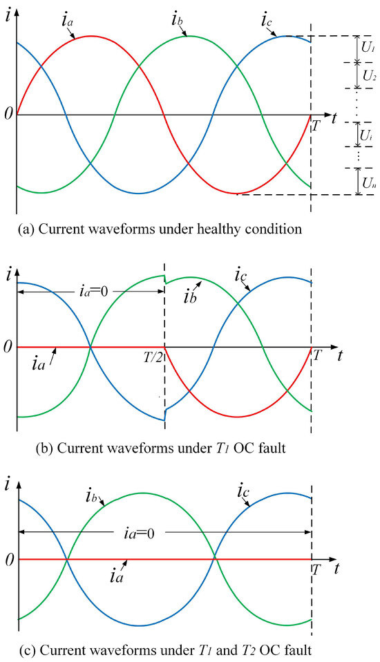 When an OC fault occurs in a power transistor such as , the current waveform will be distorted. As shown in Figure 5b, in the later half of the period, it is ’s turn to work and should be turned off, so the OC fault has no impact on the output. While in the former half of the period, should have been working. But due to the OC fault, the actual output current in phase-a is 0. The waveforms of and will also undergo distortion due to the fault, but the degree of distortion is consistent and both are relatively small. Therefore,