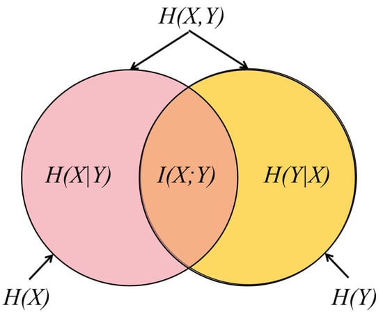 Figure 6. The relationship between information entropy, joint entropy, conditional entropy, and mutual information.Assuming X and Y are two correlated random events, their information entropy is and , respectively. Then, their joint entropy iswhere represents the sub event that belongs to . represents the sub event that belongs to and belongs to at the same time. Thus the conditional entropy is defined asIn [44], “mean conditional entropy” is proposed, which is actually an improved form of conditional entropy. The fault is diagnosed by extracting the conditional entropy between the two-phase currents of the inverter. Compared to information entropy, conditional entropy reflects the relationship between two phases and is a very effective measure of symmetry between phases. - Mutual information. As is shown in Figure 6, mutual information is a kind of entropy, which defines the degree of dependence between two almost random variables. It can be regarded as the amount of information about another random variable contained within a random variable, or in other words, the reduced uncertainty of a random variable due to the knowledge of another random variable. For two discrete random variables X and Y, their mutual information isBy analyzing the properties of conditional probability and combining Equations (19)–(22), it can be concluded thatIn [45], the mutual information between the phase currents was extracted, and then it was used as a feature dataset to train the classifier. This method achieves an effective diagnosis of motor bearing faults through mutual information of motor current signals, which is highly innovative and practical. One reason for the good performance of this study is that the motor itself and the inverter are both symmetrical structures, and both mechanical and electrical faults can cause symmetry to be disrupted. Mutual information effectively measures the symmetry of the system.