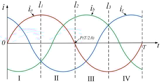 Figure 7. Current waveforms under healthy condition for analysis.Divide the current in a period T into four sub-intervals I, II, III, and IV, with each interval length . Dashed lines , , and are the dividing lines of the interval. For current signals in phase-a, the waveforms located in sub intervals I and II are symmetrical with symmetry axis . While the current waveform in intervals II and III is centrally symmetrical about , and so is the waveform in the former half and the latter half in a period. This paper refers to them as “quarter-wave symmetry (QWS)” and “half-wave symmetry (HWS)”, respectively. Moreover, in the healthy condition, in terms of the time dimension, the current waveform in the latter period is the same as or symmetrical to the previous one. Therefore, not only are the three-phase currents symmetrical, but each phase current itself is also symmetrical. Previous studies have mostly focused on the symmetry between currents in two phases, with less research on the symmetry of the current itself, which may be a worthwhile direction for further investigation. - The influence of reference frame on symmetry. In the time–current coordinate system, as shown in Figure 5, the current waveform is half-wave symmetrical under healthy conditions but asymmetric when a fault occurs. But if the three-phase currents are transformed into the - coordinate through Clark transformation, things will be different. The formula of Clark transformation is given in Equation (31), where k is a proportional coefficient. Clark transformation can transform the current in the three-phase abc coordinate system into the Cartesian coordinate system. Figure 8 shows the current trajectories in - coordinate under different conditions [58,59]. It can be seen that the waveforms of current trajectories under fault conditions are still symmetrical. Fault diagnosis can be performed through the axis of symmetry/center of symmetry. In the two-dimensional current–current coordinate system, the current trajectories are symmetrical for some types of faults, while others are not [60]. Therefore, it can be concluded that the symmetry is related to the reference frame, and the symmetry under different reference frames is also worth further research.