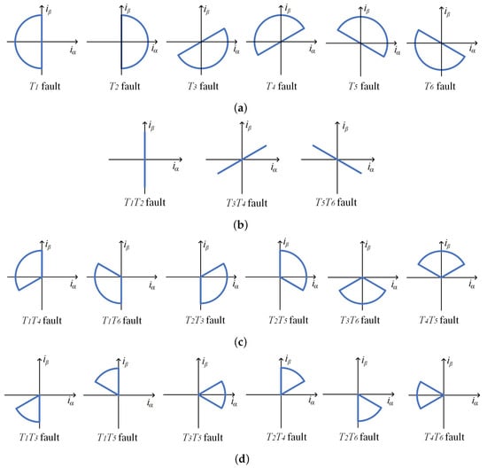 Figure 8. The current trajectories in - coordinate of a two-level three-phase inverter under four types of faults. (a) Single-transistor OC fault. (b) Double-transistor OC fault on the same leg. (c) Double-transistor OC fault on different leg (one is in the upper, the other in the lower). (d) Double-transistor OC fault occur on different leg (both are in the upper or lower).