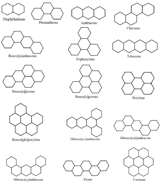 The field of mathematical chemistry utilizes math and chemistry to analyze chemical reactions and properties. In their work ([34]), Randić and Trinajstić highlight the potential of relating theoretical indices to experimental properties of benchmark datasets to assess the chemical significance of graph invariants. Following this approach, this section explores the applicability of the entire Harmonic index to elucidating structural features of molecules through the quantitative structure–property relationship (QSPR) methodology. Specifically, we focus on evaluating the effectiveness of the entire Harmonic index as a descriptor for QSPR modeling of various physicochemical properties across diverse molecules. The choice of benzenoid hydrocarbons, with their well-defined structures, allows us to represent both cyclic and acyclic chemical systems for this investigation. So, we examine the significance of the entire Harmonic index for predicting for key properties like the total -electronic energy , enthalpy of formation , and boiling points (Bp) of 16 lower benzenoid hydrocarbons, see Figure 1.