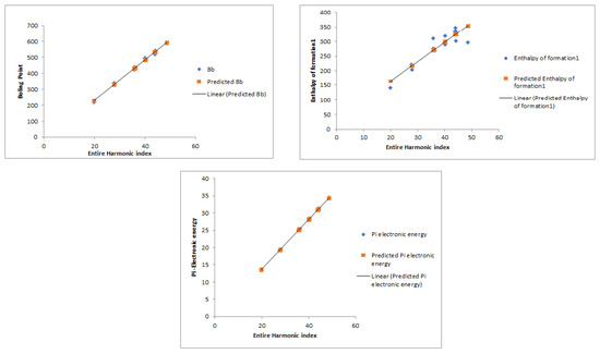 Analysis of the data in Table 1 highlights the emergence of the entire Harmonic index as a promising descriptor for diverse physicochemical properties. Constructed linear models in SPSS demonstrate statistically significant correlations with the boiling point , enthalpy of formation , and, notably, a perfect correlation with total -electronic energy , suggesting exceptional predictive potential for this property. Furthermore, Table 2 reveals the consistent advantage of the entire Harmonic index over the traditional Harmonic index, underlining its significance as a novel topological index for modeling chemical and physical properties.