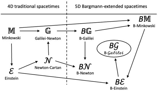 Finally, a word about causality. Recall that for , vectors are classified as timelike for , spacelike for , and null for . These correspond to vectors ‘inside’ the null cone, ‘outside’ the null cone, and ‘on’ the null cone, respectively. It is well known that for two events separated by a spacelike vector, it is possible for the sign of the time interval between them to be reversed by a Lorentz transformation. In contrast, while simultaneity is relative for two events separated by a timelike vector, the time ordering of the events is invariant. Particles, and signals transmitted by field disturbances, must have timelike worldlines (curves in with tangent vectors everywhere timelike) or straight null worldlines (curves in with unchanging null tangent vector) directed toward the future. However, in the case of , the distinction between spacelike and null vectors vanishes as the past and future light cones merge with the invariant surface of simultaneity. Time intervals between events are invariant under Galilei transformations. There is no upper limit to the speed of particles or of signals transmitted by field disturbances, and indeed, forces affecting instantaneous action at a distance are not excluded. For , vectors are classified as timelike for and null/spacelike for .