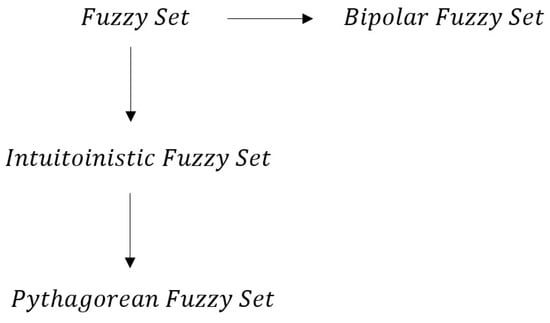 Intuitionistic fuzzy sets [] were defined by adding the degree of non-membership to fuzzy sets. Thus, this concept helps solve broader, real-life problems. The intuitionistic fuzzy set considers membership and non-membership degrees during analysis. For instance, in the fuzzy set, the degree of sweetness is given in the interval [0, 1], while in an intuitionistic fuzzy set, the degree of sweetness () and the degree of non-sweetness () are added to handle more general problems. In intuitionistic fuzzy sets, we have . Suppose that and , we obtain , but . We could not solve this kind of problem in an intuitionistic fuzzy set. Therefore, Pythagorean fuzzy sets [] were defined, which are more general than intuitionistic fuzzy sets because of their ability to model using incoherent data. These sets are characterized by the condition that the sum of the squares of membership and non-membership grades is less than or equal to 1. Thus, the sum of membership and non-membership grades can exceed 1. Table 1 summarizes the advantages of these structures. By continuing the generalizations of fuzzy sets (neutrosophic fuzzy sets [], picture fuzzy sets [], spherical fuzzy sets [], Pythagorean fuzzy sets []), the definition of bipolar fuzzy set was given by Zhang []. Bipolar-valued fuzzy sets are an extension of fuzzy sets with bipolarity.
